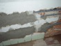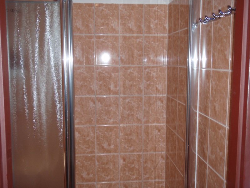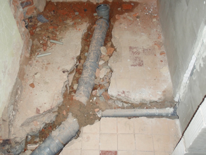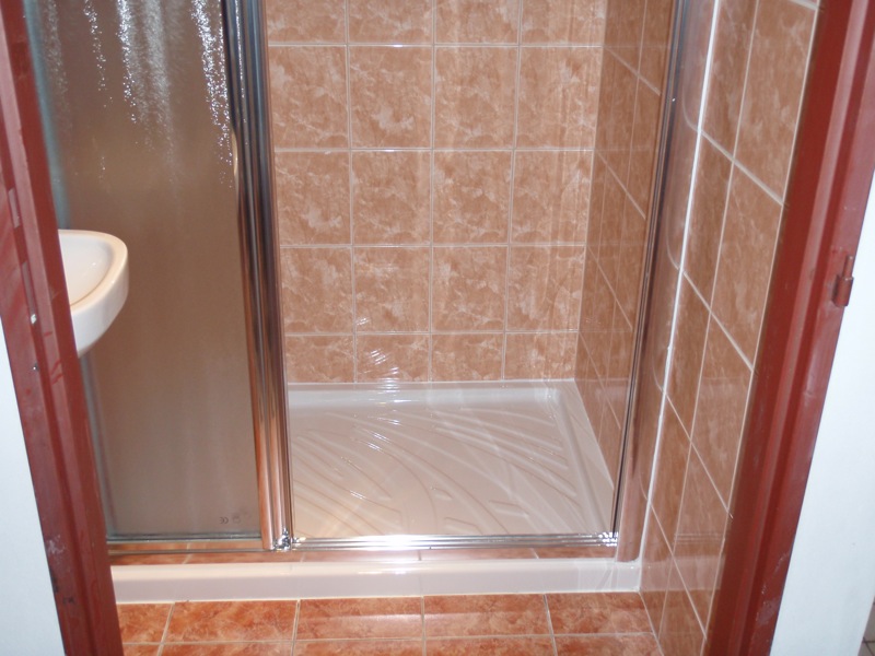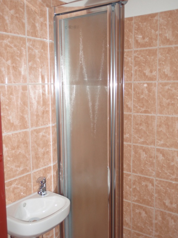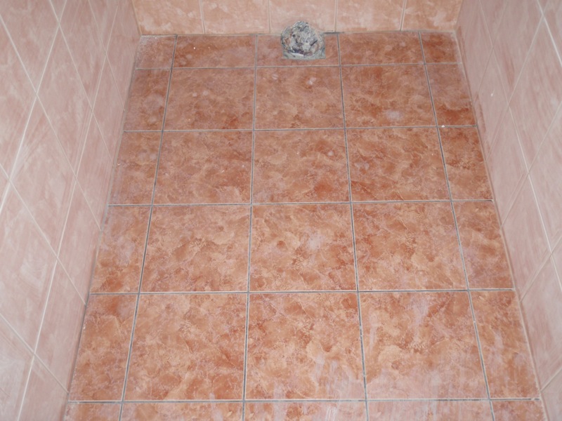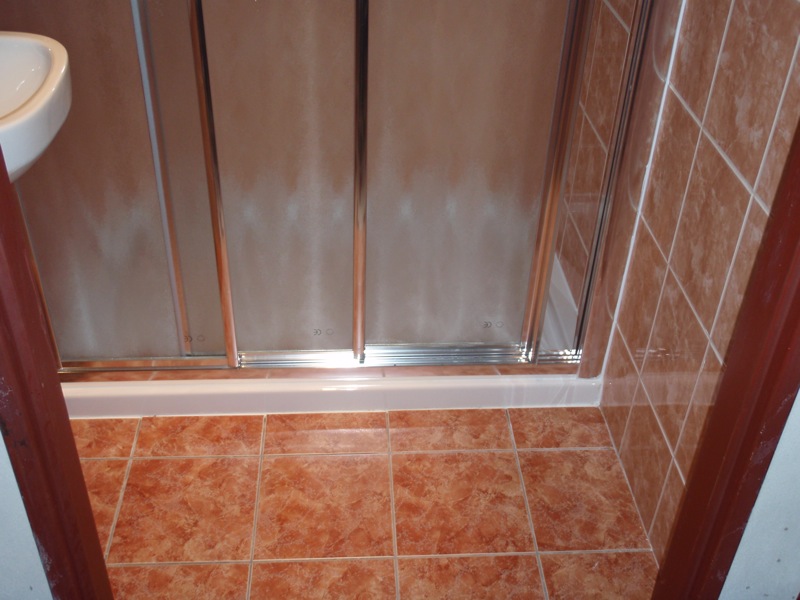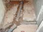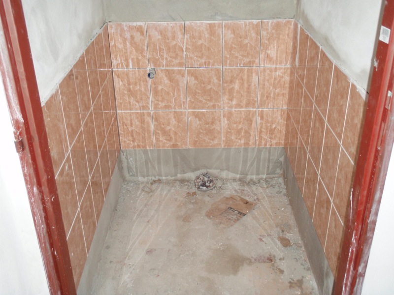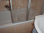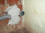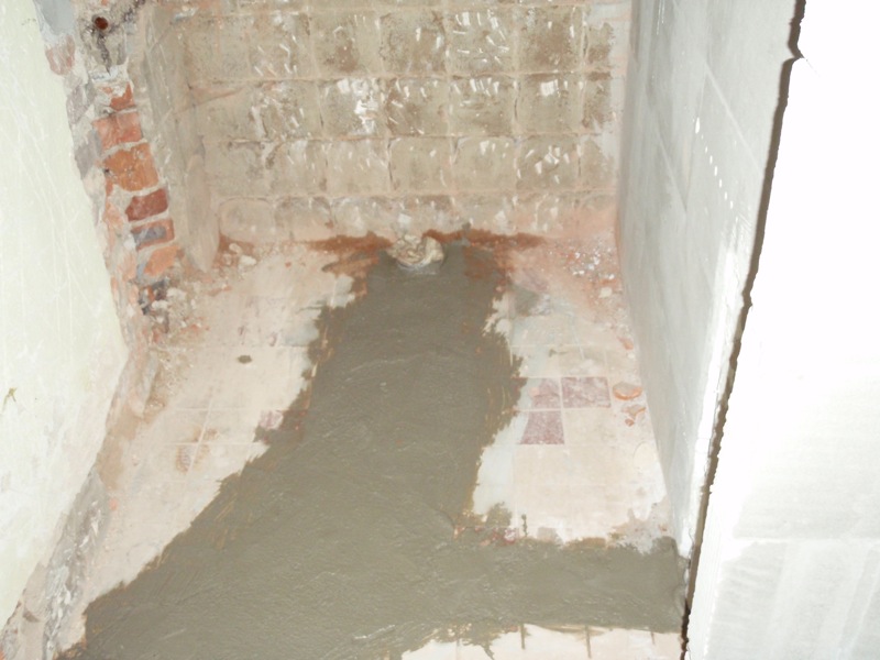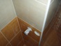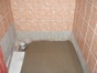 - Úprava podlahy v koupelně a WC penetrací, lepícím tmelem a částečně cementovým potěrem. Pokládka dlažby v koupelně a WC.
